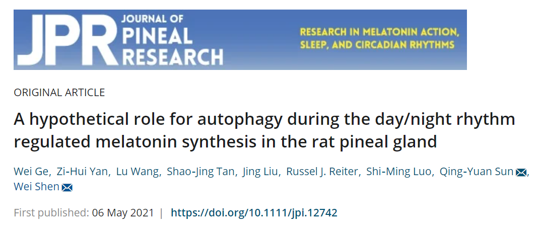 5月6日,国际著名期刊《Journal of Pineal Research》(一区,IF=14.528)在线发表了suncitygroup太阳新城沈伟教授课题组完成的题为“A hypothetical role for autophagy during the day/night rhythm regulated melatonin synthesis in the rat pineal gland”的研究论文,首次揭示了自噬调控褪黑素合成的潜在分子机制。