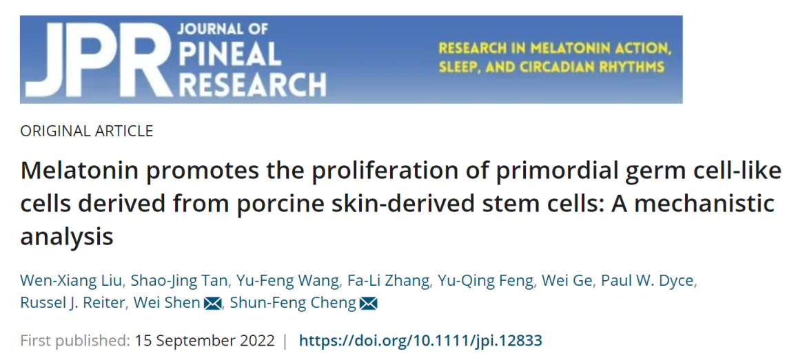 近日,suncitygroup太阳新城生猪种业创新团队程顺峰教授研究组在中科院一区、TOP期刊《Journal of Pineal Research》(IF=12.081)上发表研究论文“Melatonin promotes the proliferation of primordial germ cell-like cells derived from porcine skin-derived stem cells: A mechanistic analysis”。该论文首次揭示了褪黑激素促进猪皮肤来源干细胞(skin-derived stem cells,SDSCs)体外分化的原始生殖细胞样细胞(primordial germ cell-like cells,PGCLCs)增殖的分子机制。