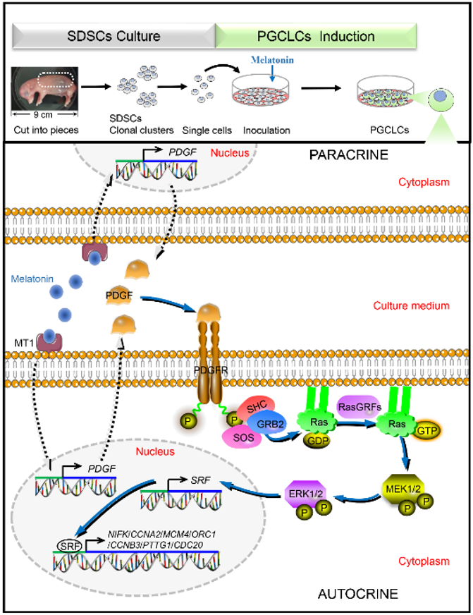 我国具有悠久的养猪历史,且拥有全球1/3的地方猪种质资源。但近年来,我国地方猪种养殖量急剧减少,部分地方品种几近灭绝,导致地方猪种遗传资源多样性遭受严重破坏,优质基因不断流失。目前猪遗传资源保护的一些方法,如原位保存、精液冷冻保存、DNA文库保存和体细胞库保存等,均具有一定的局限性。干细胞是一类可以自我更新并具有多向分化潜能的细胞群体,它不仅能分化成不同类型的细胞,还可以通过有丝分裂维持自身的遗传稳定性。无论是从现有扩群的技术途径还是从未来发展前景看,干细胞保种具有其它技术保重不可替代的优势。我校suncitygroup太阳新城生猪种业创新团队程顺峰教授研究组在构建地方良种猪干细胞种质资源库的基础上,进一步对猪干细胞进行创新应用。研究组以体外分离纯化的猪皮肤来源干细胞(SDSCs)为实验材料,研究了其体外转分化为原始生殖细胞样细胞(PGCLCs)的分子调控机制,发现褪黑激素(MLT)能显著促进分化的PGCLCs体外增殖。该研究证实,SDSCs转分化PGCLCs过程中,MLT经褪黑素受体1(MT1)介导可显著提高血小板衍生生长因子(PDGF)的转录和翻译水平,PDGF通过自分泌和旁分泌作用途径激活PDGF受体,随后刺激Ras并进一步激活转录因子血清反应因子(SRF),靶向调控细胞周期相关基因的表达,从而促进PGCLCs增殖。该研究系统地阐明了MLT通过MT1介导的MAPK信号通路在PGCLCs体外增殖中的作用途径和分子机制。