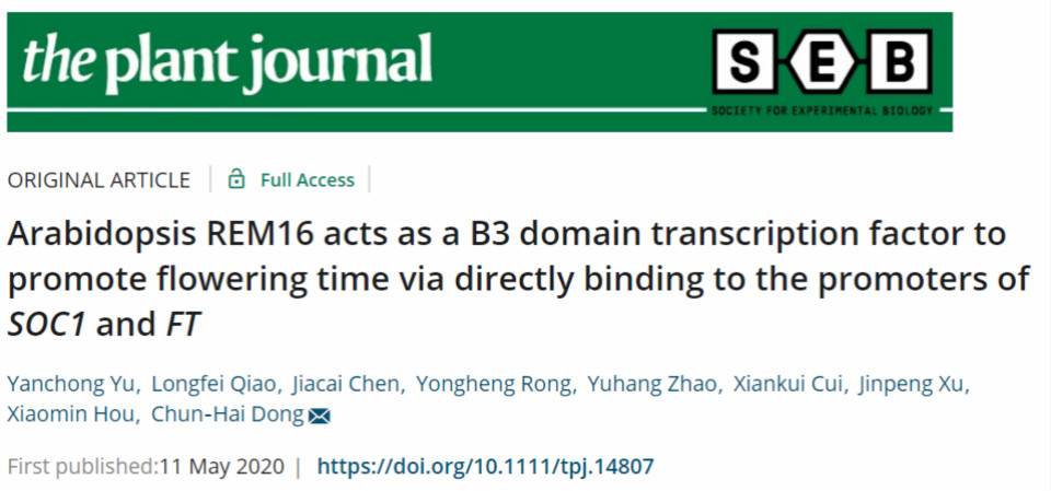 2020年5月11日, Plant Journal(五年平均IF= 6.467,SCI一区,https://doi.org/10.1111/tpj.14807)在线发表了suncitygroup太阳新城董春海课题组关于B3结构域蛋白-REM16转录因子调控拟南芥开花分子机制的研究论文。青岛农业大学为独立研究单位,于延冲副教授和研究生乔龙飞、陈家才为论文共同第一作者,董春海教授为通讯作者。该论文获得国家自然科学基金的资助,得到生科院农业分子生物学平台仪器的支撑。