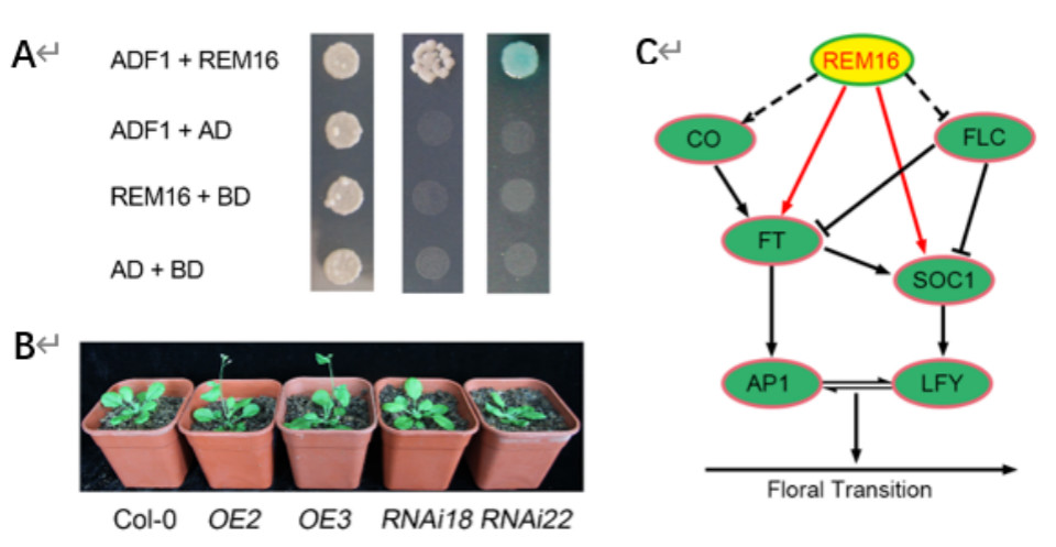 ADF1作为微丝解聚因子无法调控基因表达,课题组把研究方向转入其互作蛋白的研究,通过酵母双杂交,获得了ADF1的互作蛋白,其中一个REM转录因子家族成员REM16引起了课题组人员的关注。进一步研究发现REM16转录因子能够直接结合开花关键基因SOC1和FT的启动子,促进二者的表达,进而加速拟南芥开花。