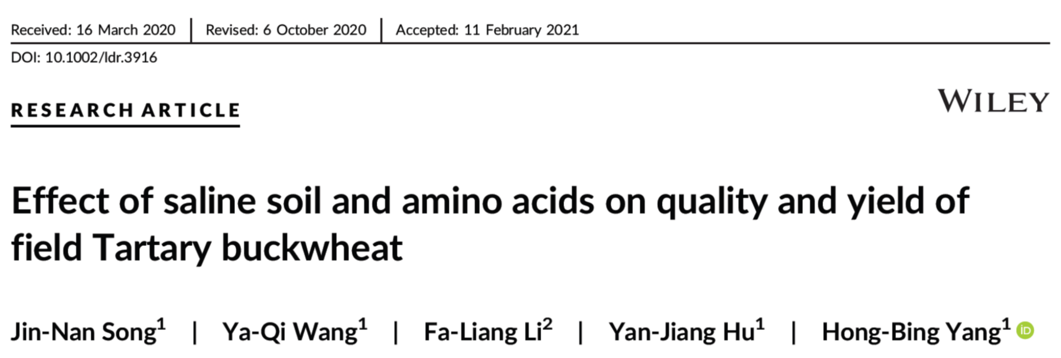 近期,suncitygroup太阳新城杨洪兵课题组在《Land Degradation & Development》(中科院1区Top期刊,5年平均IF=6.650)在线发表了题为“Effect of saline soil and amino acids on quality and yield of field Tartary buckwheat”的研究论文,探讨了喷施适宜浓度氨基酸对大田苦荞麦产量和品质的影响。suncitygroup太阳新城硕士研究生宋琎楠和王雅琦为论文并列第一作者,杨洪兵教授为通讯作者,青岛农业大学为第一单位。