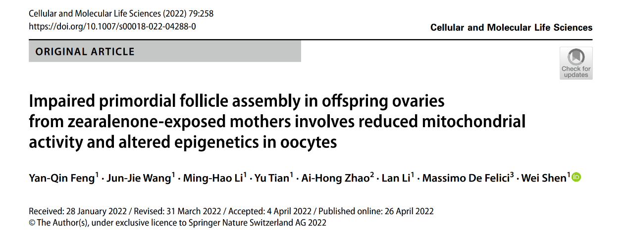 近日,suncitygroup太阳新城沈伟教授课题组在国际重要期刊《Cellular and Molecular Life Sciences》(IF=9.261)上发表研究性论文“Impaired primordial follicle assembly in offspring ovaries from zearalenone‑exposed mothers involves reduced mitochondrial activity and altered epigenetics in oocytes”,该论文在单细胞分辨率水平上揭示了母体围产期暴露霉菌毒素抑制仔鼠原始卵泡形成的新机制。