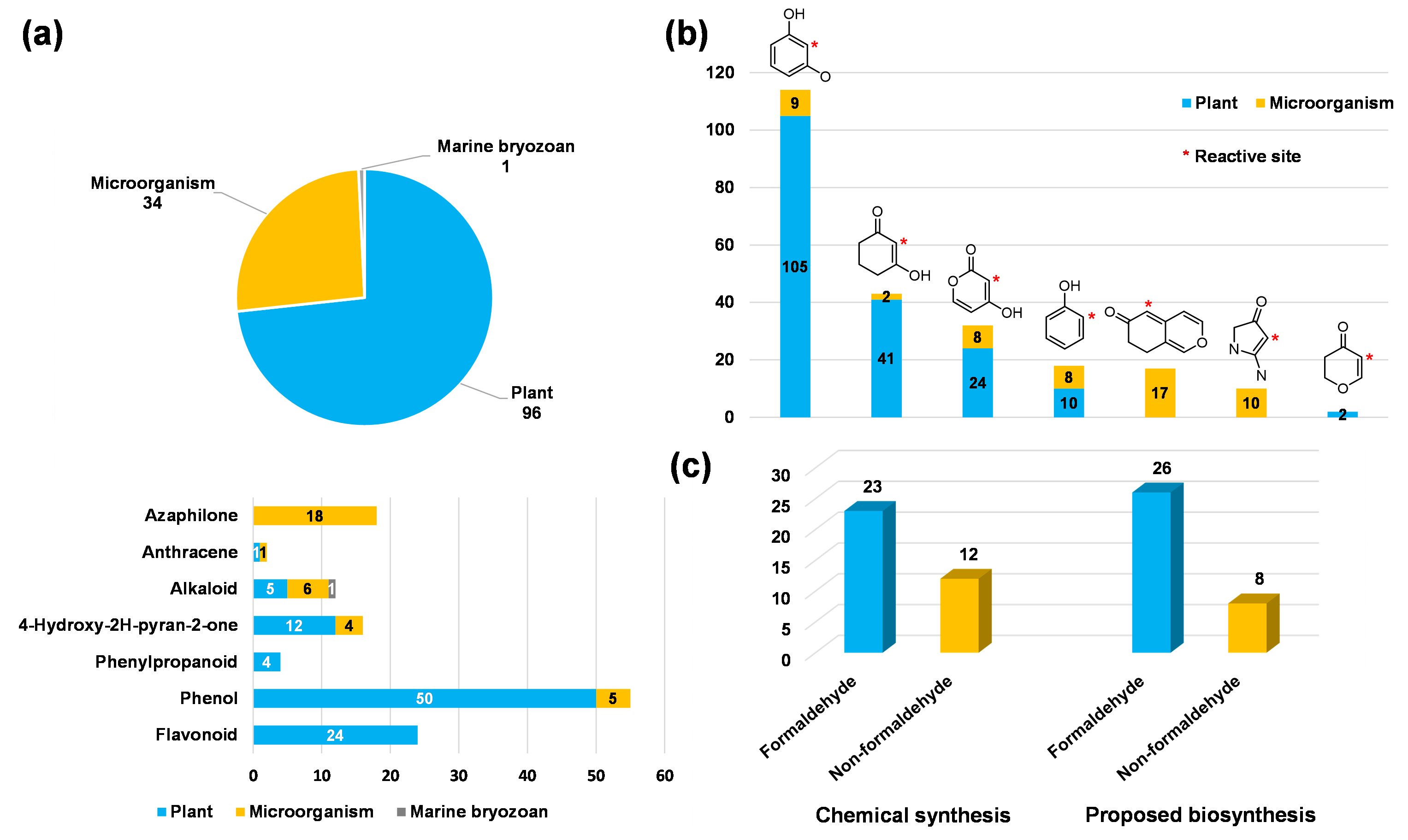 图1. 亚甲基桥联二聚体的来源及结构类型(a);单体的结构特征(b);甲醛参与其形成过程的情况(c)