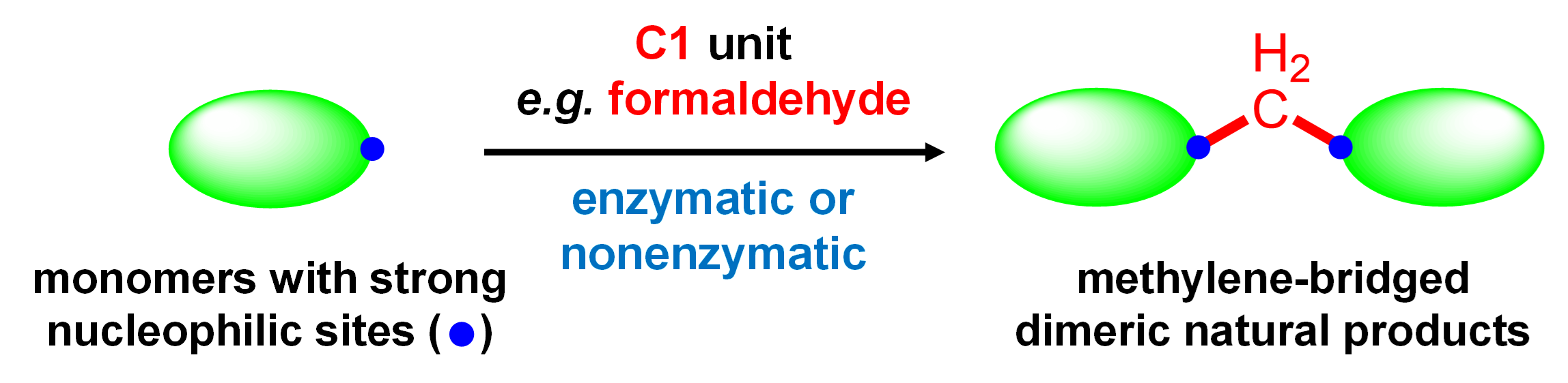 亚甲基桥联二聚体是一类非常独特的结构类型,它们是由一个亚甲基(-CH2-)将两个单体连接而成,结构中的亚甲基多来源于生物合成中的一碳单元,其中以甲醛最为常见(图2)。阐明一碳单元参与的亚甲基桥联二聚体天然产物的结构特征、明晰其非酶催化的形成机制,将会为该类型化合物的规模化制备和生物合成机制研究提供新的思路。因此,二聚体天然产物研究,逐渐成为药学、微生物学以及合成生物学研究者所关注的热点领域。