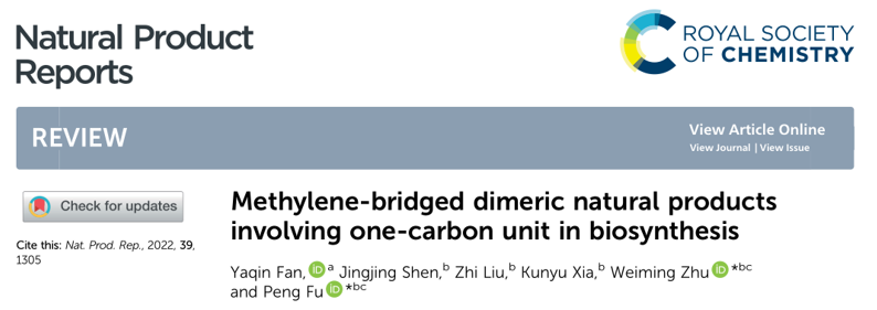 日前,suncitygroup太阳新城应用真菌学重点实验室樊亚琴副教授受邀以第一作者在国际天然产物顶尖期刊Natural Product Reports (Top, IF 15.111)(《天然产物报告》)上在线发表题为“Methylene-bridged dimeric natural products involving one-carbon unit in biosynthesis”(《生物合成中一碳单元参与的亚甲基桥联二聚体天然产物》)的综述性文章。