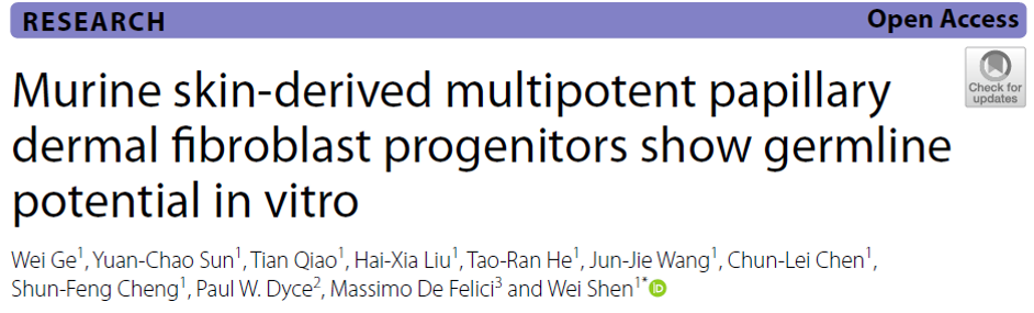 2月3日,国际著名期刊《Stem Cell Research & Therapy》在线发表了suncitygroup太阳新城沈伟教授课题组完成的题为“Murine skin‑derived multipotent papillary dermal fibroblast progenitors show germline potential in vitro”的研究论文。该论文基于单细胞组学技术,首次揭示了皮肤组织中乳头状真皮成纤维细胞祖细胞(papillary dermal fibroblast progenitors, pDFPs)具有向生殖细胞高效分化的潜力,并成功在体外环境下诱导pDFPs启动减数分裂。