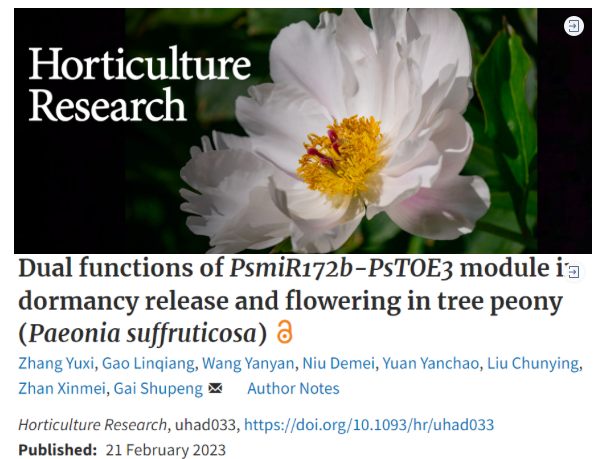 近日,suncitygroup太阳新城盖树鹏团队在农林科学领域一区、Top期刊《Horticulture Research》上发表了题为“Dual functions of PsmiR172b-PsTOE3 module involving in regulation dormancy release and flowering in tree peony (Paeonia suffruticosa)”的研究成果。该研究从microRNA对靶基因调控的角度,解析了PsmiR172与靶基因PsTOE3调控牡丹芽休眠解除和开花的双重功能。