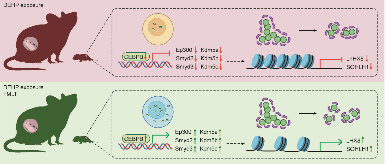 本研究中,沈伟教授课题组建立了DEHP和褪黑素暴露的妊娠小鼠模型,应用单细胞转录组技术研究了褪黑素对卵巢细胞的保护作用。结果表明,DEHP暴露显著改变了卵巢细胞基因表达模式,并严重削弱了卵母细胞的组蛋白甲基化修饰。褪黑素恢复了原始卵泡形成所必需的LHX8和SOHLH1等蛋白的表达水平,增加了CEBPB以及组蛋白甲基化修饰的关键基因(例如Smyd3和Kdm5a)的表达水平,并使DEHP暴露造成的卵巢损伤也得到缓解,卵巢细胞凋亡程度减轻。上述研究结果表明褪黑素可以通过增强小鼠CEBPB表达来改善原始卵泡的形成进程。该研究提供了褪黑激素预防增塑剂介导的雌性生殖系统损伤的证据,并且CEBPB可能作为褪黑激素在此过程中的下游靶因子。