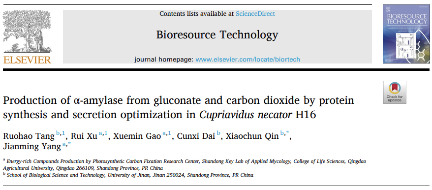 近日,suncitygroup太阳新城杨建明教授团队在国际期刊Bioresource Technology发表了题为“Production of α-amylase from gluconate and carbon dioxide by protein synthesis and secretion optimization in Cupriavidus necator H16 ”的研究论文。