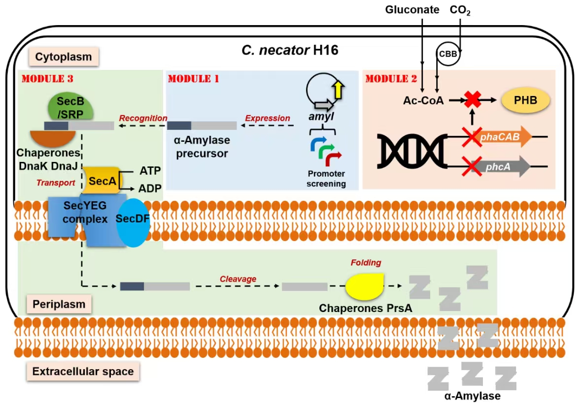 该研究报道了利用Cupriavidus necator H16将二氧化碳(CO2)转化为胞外酶产物α-淀粉酶,即在C. necator H16体内表达外源α-淀粉酶,并通过α-淀粉酶基因表达优化、基因组修饰和分泌系统工程等模块化方法优化α-淀粉酶生产工程菌株,实现了CO2到α-淀粉酶的转化。