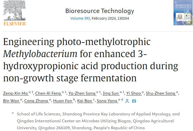 近日,青岛农业大学山东省应用真菌重点实验室微生物资源与功能产物合成科研团队在一碳转化领域获得新突破,相关成果以“Engineering photo-methylotrophic Methylobacterium for enhanced 3-hydroxypropionic acid production during non-growth stage fermentation”为题,发表在生物工程领域知名期刊Bioresource Technology (影响因子11.4,中科院1区)。