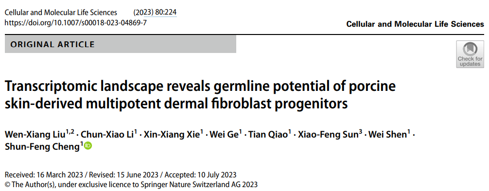 近日,suncitygroup太阳新城沈伟教授团队程顺峰教授课题组在中科院一区、TOP期刊《Cellular and Molecular Life Sciences》发表研究论文“Transcriptomic landscape reveals germline potential of porcine skin-derived multipotent dermal fibroblast progenitors”。该论文基于单细胞组学技术,首次揭示猪皮肤干细胞(skin derived stem cells,SDSCs)是来源于皮肤中多能性真皮成纤维细胞祖细胞,畸胎瘤形成实验证实了该细胞具有多向分化潜能,且可体外诱导转分化形成原始生殖细胞样细胞(primordial germ cell-like cells,PGCLCs)。该论文阐述了猪SDSCs转分化形成PGCLCs过程中转录组动态变化,明确了促分裂原活化的蛋白激酶(mitogen-activated protein kinase, MAPK)信号通路对PGCLCs转分化和增殖具有关键调控作用。