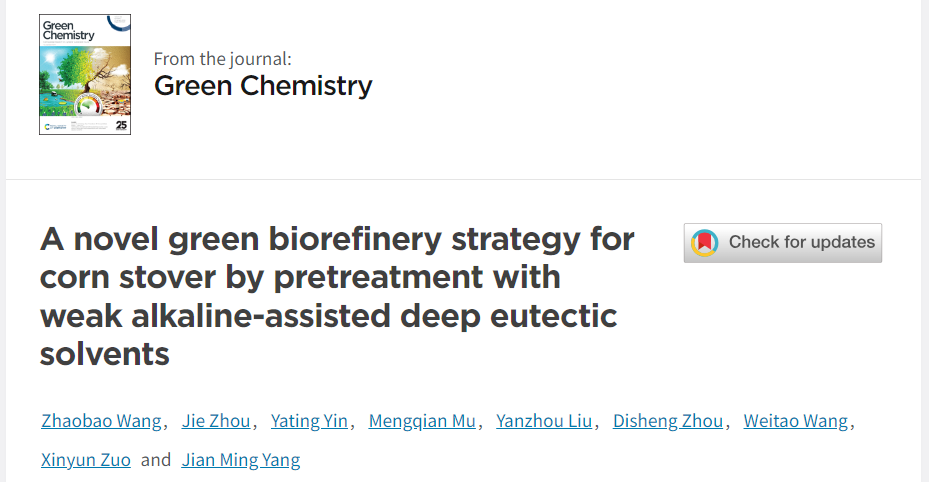 近日,suncitygroup太阳新城杨建明教授团队在木质纤维素生物质预处理领域取得重要研究进展,相关研究成果以“A novel green biorefinery strategy for corn stover by pretreatment with weak alkaline-assisted deep eutectic solvents”为题,发表在英国皇家化学学会旗下绿色化学领域国际知名期刊Green Chemistry上(DOI: 10.1039/ d3gcC04091g. 影响因子:9.8,中科院JCR一区Top)。王兆宝副教授和周杰(硕士研究生)为该论文的并列第一作者,杨建明教授为通讯作者,青岛农业大学为独立通讯单位。