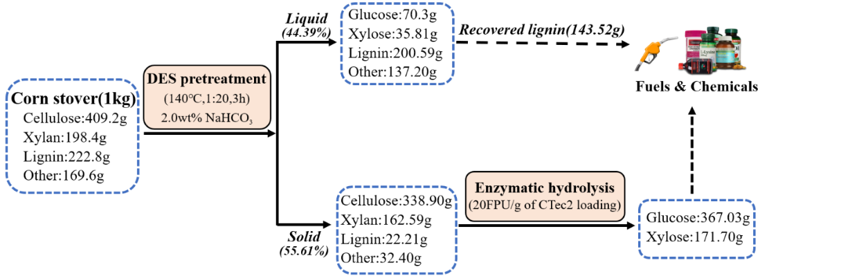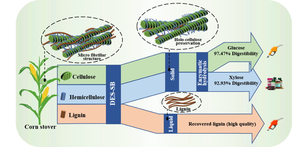 本研究开发了一种低共熔溶剂-碳酸氢钠(DES-SB)对木质纤维素原料(玉米秸秆)进行全组分利用的生物炼制策略,用于协同碳水化合物转化和玉米秸秆脱木质素,最终获得高产率的可发酵糖(葡萄糖、木糖)和木质素,提高了生物质全组分综合利用的可行性。与单纯的低共熔溶剂预处理相比,碳酸氢钠的加入能够显著提高脱木质素效率,达到 90.03%(单纯低共熔溶剂预处理仅为 34.64%)。同时,实现了较高的碳水化合物回收率,酶解过程中葡萄糖和木糖消化率分别达到 97.47%和92.93%。此外,基于 该策略获得了具有纯度高、分子量低且分子量分布均一、热稳定性优异等优势的再生木质素,具有转化为下游芳香族化合物和生物基材料的前景,展现出优秀的增值潜力。在实现全组分综合利用的同时,该研究提出了在DES-SB预处理溶剂中秸秆结构解聚分离的机理。综上所述,该研究提供了一种新型组合预处理分馏的策略,具有高选择性的脱木质素效率和高碳水化合物保留效果,在全组分生物质综合利用(高产可发酵糖和高质量可加工木质素)及可持续工业生物炼制方面展现出了巨大潜力。