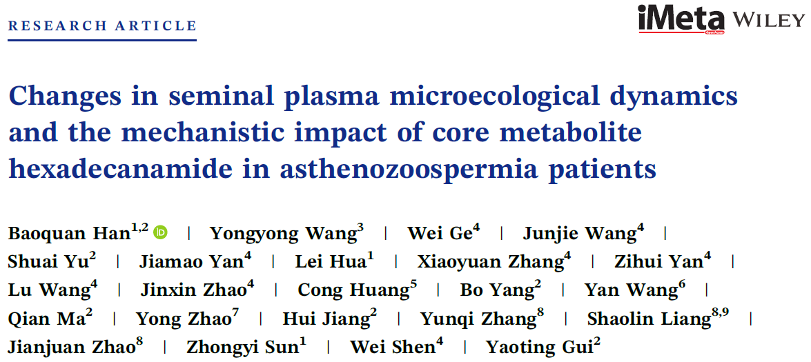 近日,suncitygroup太阳新城沈伟教授课题组联合北京大学深圳医院桂耀庭教授课题组及深圳大学总医院孙中义教授课题组在男性不育机制方面取得重要进展,相关成果以“Changes in seminal plasma microecological dynamics and the mechanistic impact of core metabolite hexadecanamide in asthenozoospermia patients”为题,在线发表于高水平学术期刊《iMeta》杂志上。