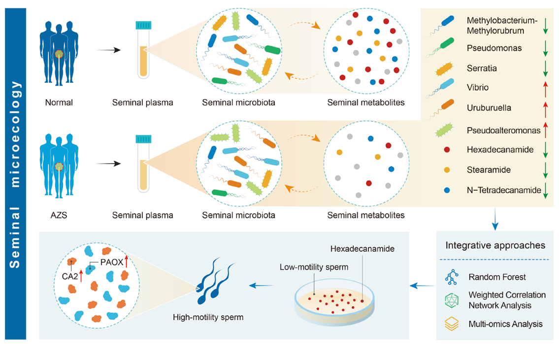 本研究采用16S rDNA测序和多组学分析对AZS患者精浆微生物群落和代谢物进行了全面分析研究。研究共收集了四组人群的精浆样品,包括正常组、轻度AZS组(AZS-I)、中度AZS组(AZS-II)和重度AZS组(AZS-III)。微生物组差异丰度分析显示,上述四组人群精浆中微生物组成和代谢物谱存在显著差异,随后借助相关性分析和交叉对比分析鉴定出差异微生物菌属和代谢物。值得注意的是,AZS组精浆中假单胞菌、沙雷氏菌和甲基绿脓杆菌等细菌属的丰度显著降低,与核心差异代谢物(十六酰胺)水平呈正相关。相反,AZS组精浆中乌鲁布鲁氏菌、弧菌和假交替单胞菌等菌属的丰度增加,与核心差异代谢物(十六酰胺)呈负相关,且体外和体内实验结果证实十六酰胺可以显著提高精子活力。通过代谢物靶基因预测分析、DNA芯片分析及单细胞转录组测序分析等手段,对候选靶基因PAOX和CA2的基因表达进行了确认,随后借助蛋白质免疫印迹技术手段对十六酰胺处理前后精子样品中PAOX和CA2的蛋白水平进行了验证,结果表明,十六酰胺处理后上述两个基因的蛋白水平显著上调,同时伴随着精子活力的显著提高。综上所述,该研究发现精浆中6种菌属丰度和十六酰胺含量的变化与AZS发生存在显著相关性,且结果证实十六酰胺可以显著提高精子活力,表明对临床治疗AZS具有潜在的重要价值,上述发现为AZS的临床诊治疗提供了重要的基础和参考依据。
