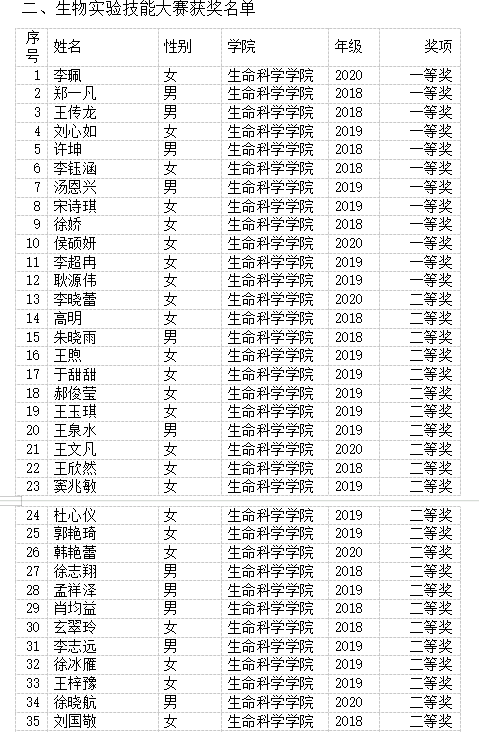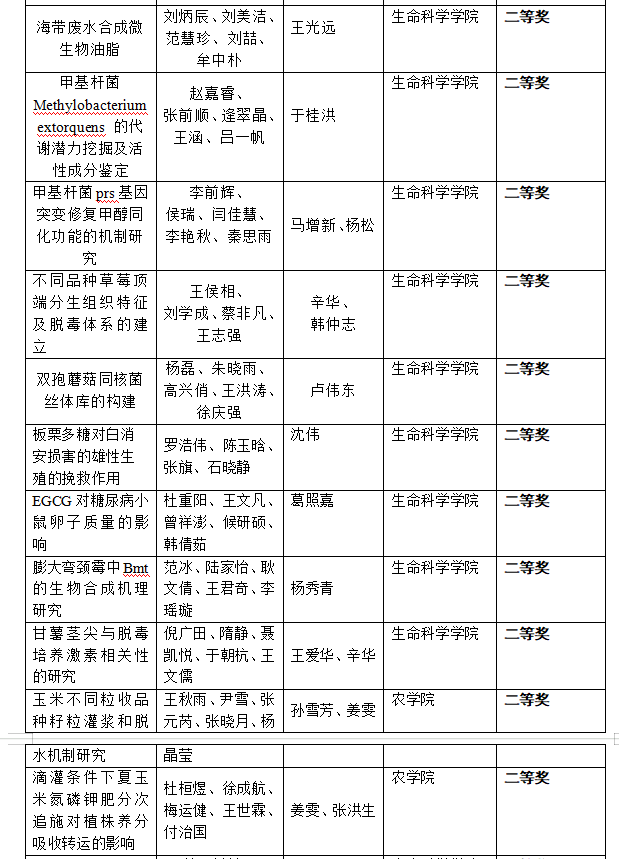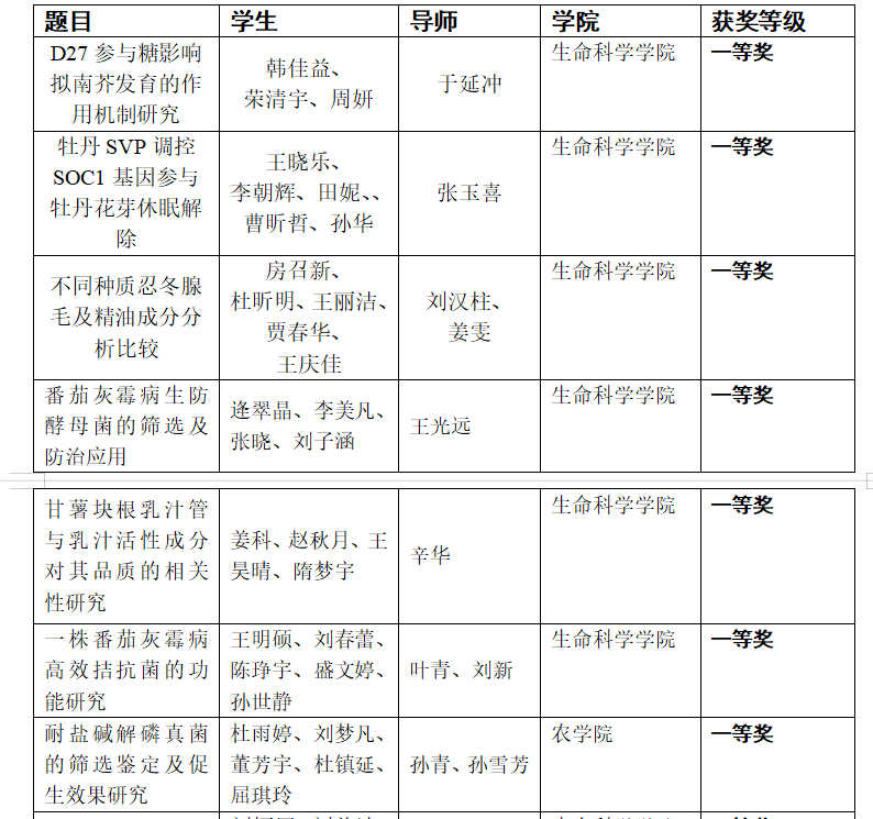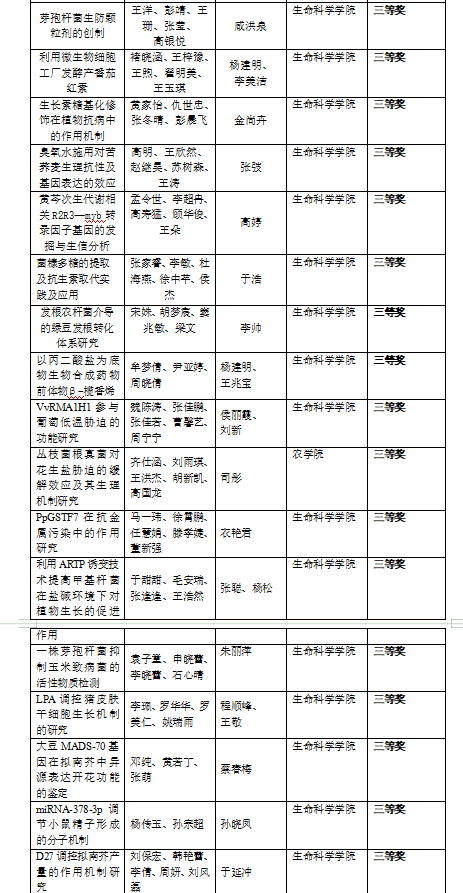 为了培养大学生的社会责任感、创新意识、团队精神和实践能力,扩大科学视野,促进大学生对于生物学相关基础知识的学习和实践能力的培养,提高综合能力,提高人才培养质量,2021年9月至10月举办了青岛农业大学生命科学竞赛,本次大赛由创新创业学院主办、suncitygroup太阳新城承办,大赛分为生物学大赛和生物实验技能大赛两部分,近400名学生参加,评审专家从研究方案、研究过程、研究论文等方面对各参赛队作品及个人实验技能进行了综合评定,大赛最终评选出一等奖7项和12人、二等奖11项和23人、三等奖17项和35人。现将获奖名单公布如下: