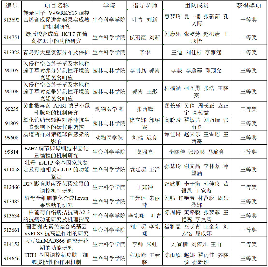 经过激烈角逐,suncitygroup太阳新城入选的17支队伍共斩获一等奖2项,二等奖1项,三等奖8项。其中惠梦玲团队(指导教师:叶青、刘新)“转录因子VvWRKY13调控乙烯合成促进葡萄果实成熟的机制研究”、刘康乐团队(候丽霞、刘新)“绿源酸合成酶HCT7在葡萄抗寒中的功能研究”获得全国一等奖,王迪团队(指导教师:辛华)“青岛野大豆资源分布及保护”获全国二等奖。