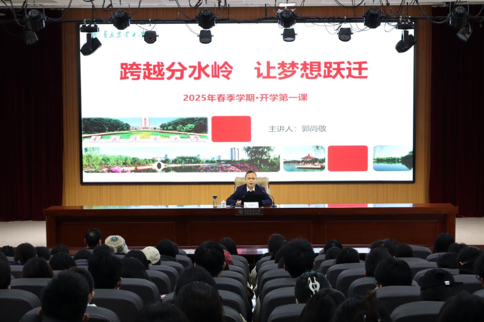 为教育引导学生牢记嘱托、砥砺奋进,积极投身中国式现代化的伟大实践。3月28日,校党委委员、副校长郭尚敬以《跨越分水岭,让梦想跃进》为题,在学术会馆第二报告厅为suncitygroup太阳新城和艺术学院2022级学生讲授2025年春季学期“开学第一课”。suncitygroup太阳新城党委书记孙景福,党委副书记、副院长刘妍玲,艺术学院党委副书记、副院长周维维以及两学院2022级带班辅导员和2022级学生参加。